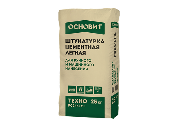 Штукатурка цементная легкая ТЕХНО PC24/1 ML предназначена для выравнивания стен из бетона, кирпича, ячеистого бетона.